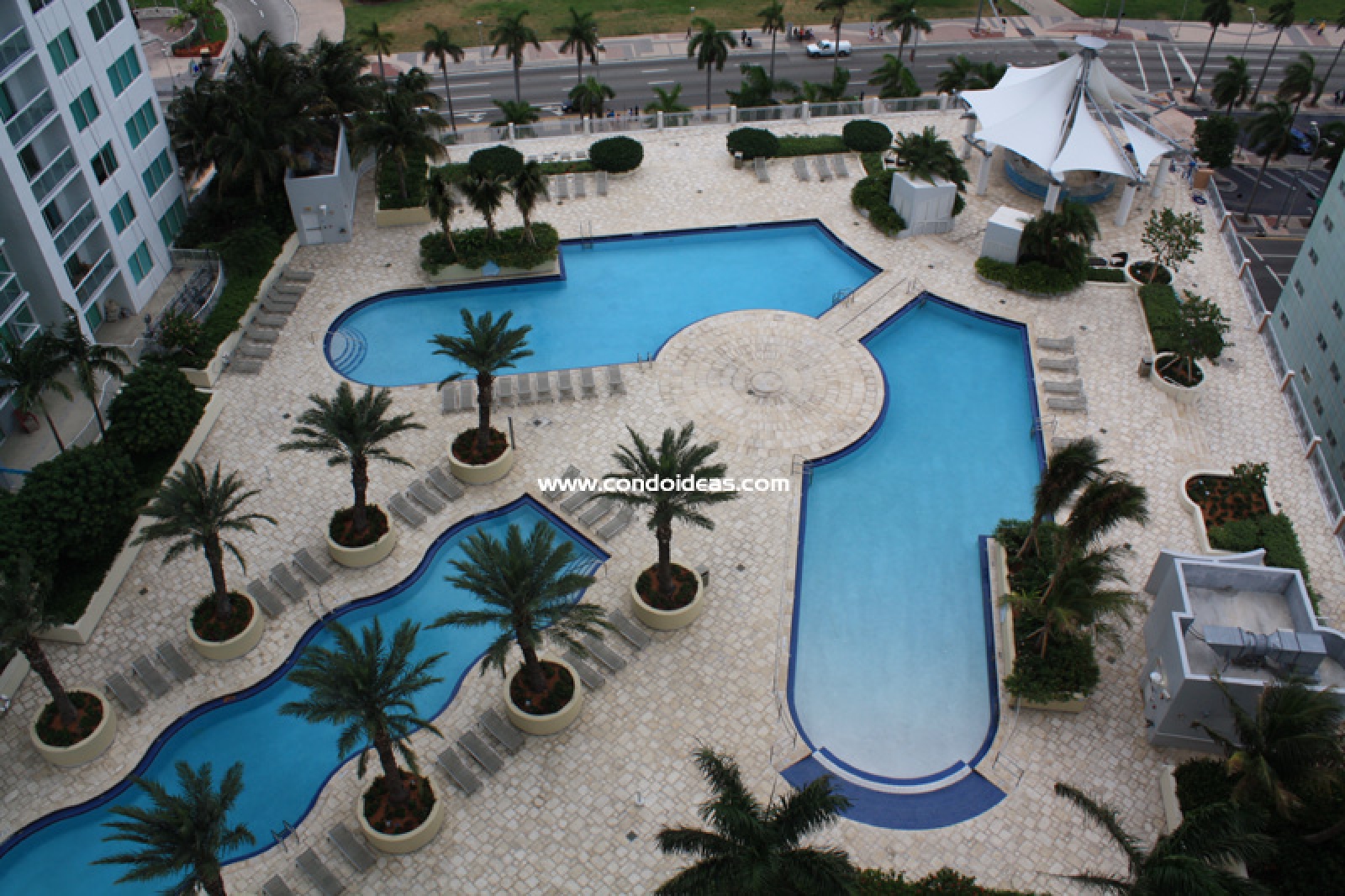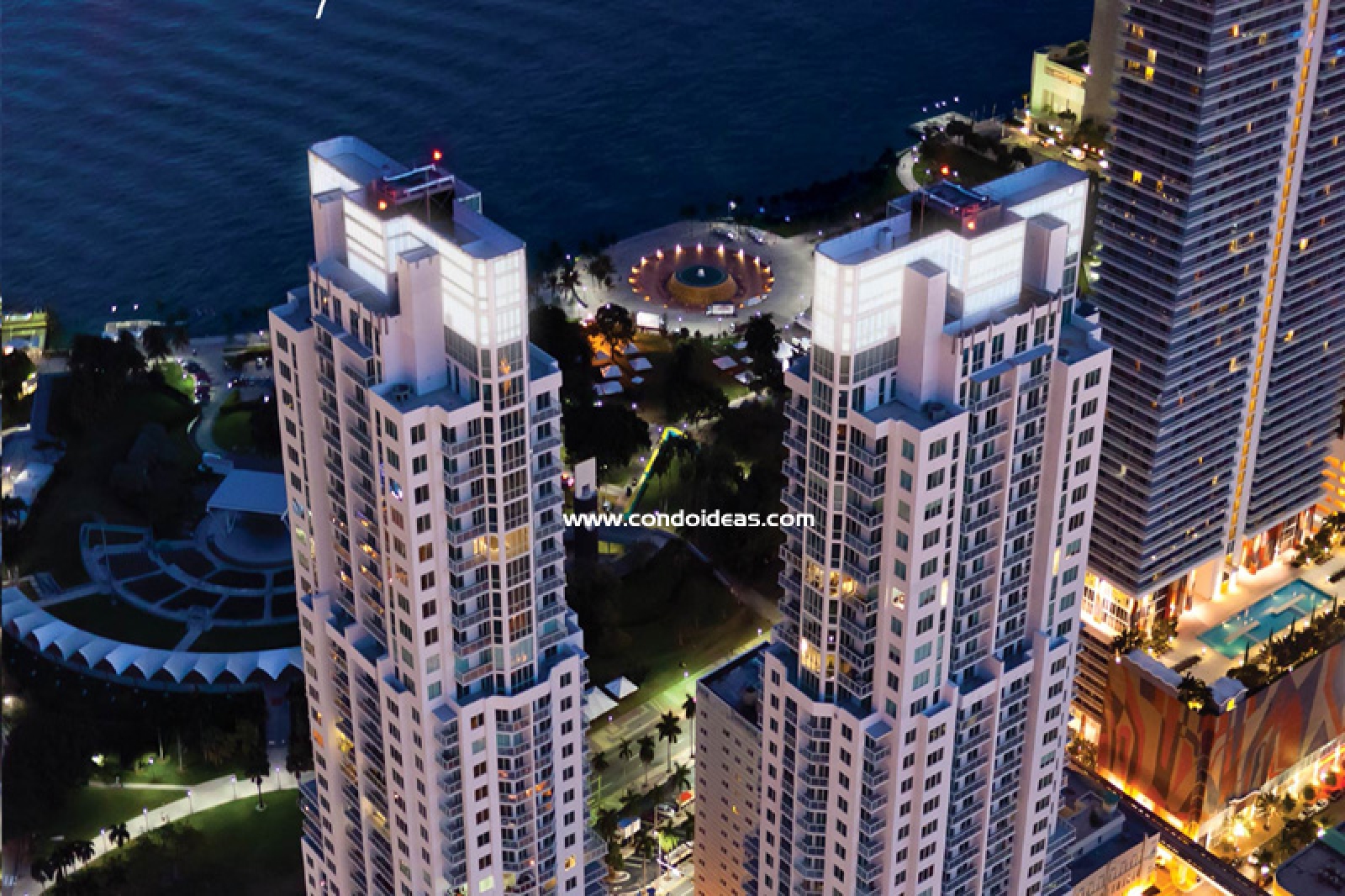Three eight floor roof-top swimming pools -lagoon-style morning pool, a lap pool and a quite pool- overlooking Biscayne Bay and city skyline
