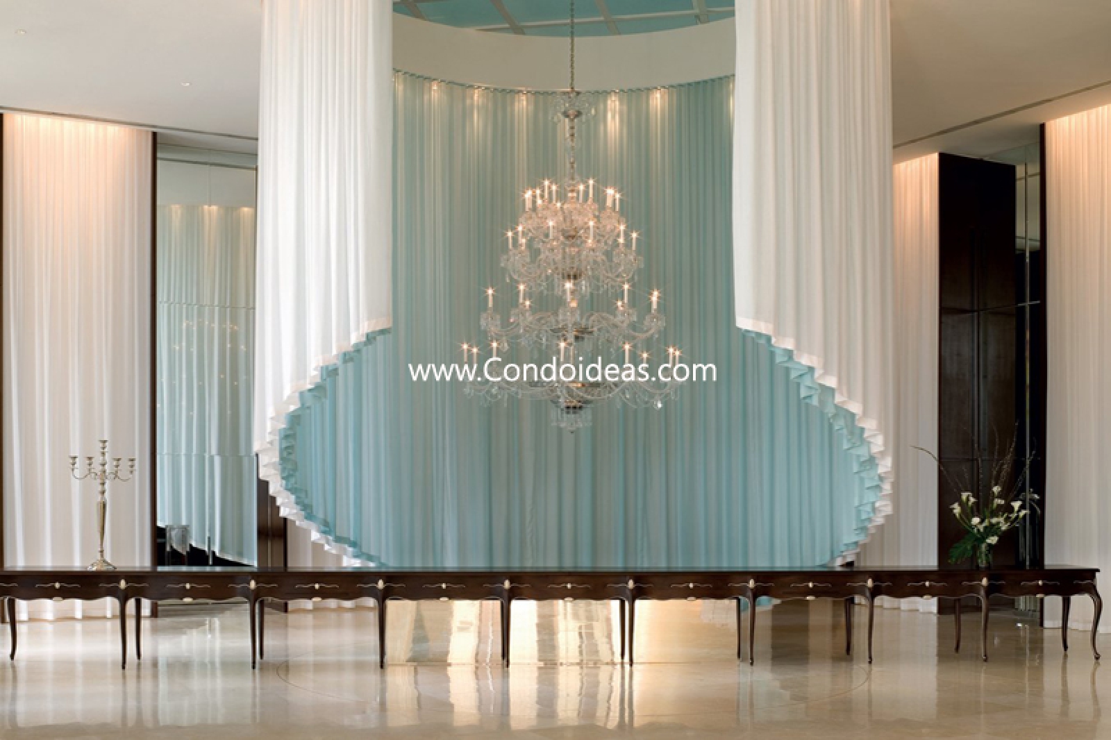 Reception desk that stretches a fanciful 40 feet and is enshrouded in a semi-circle of white curtain