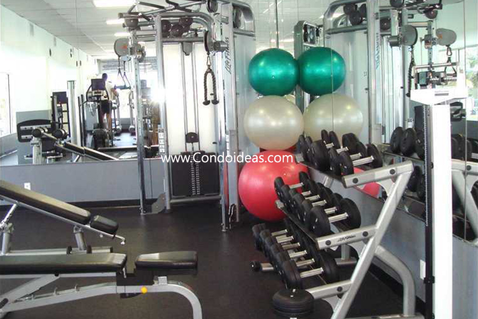 Complete fitness center with view to the pool.