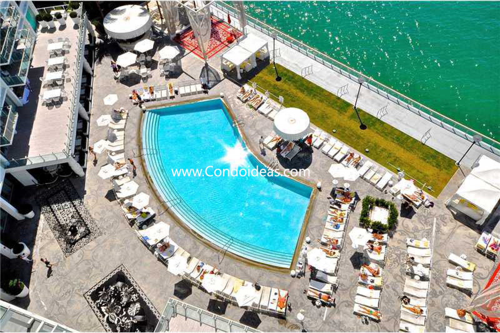 Custom-shaped swimming pool featuring Marcel Wanders' outdoor chandelier hanging overhead