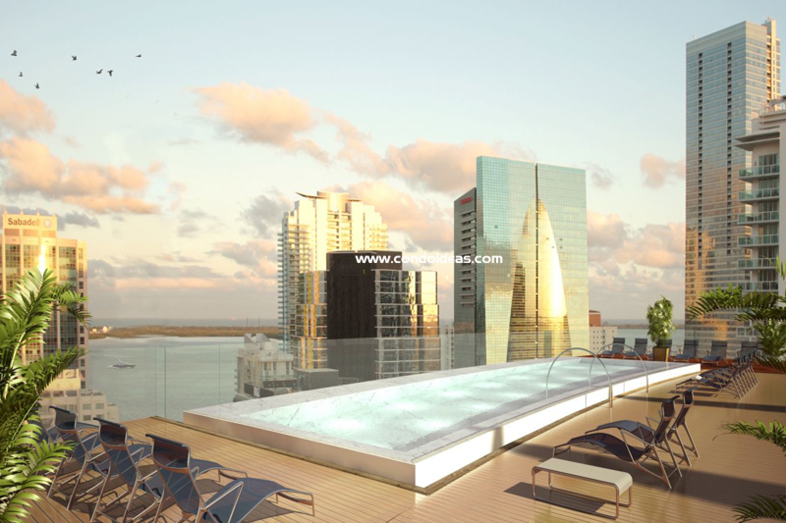 Exclusive 43rd floor Cielo Club amenities deck with private cabanas and infinity pool overlooking dramatic views of Biscayne Bay and the city skyline