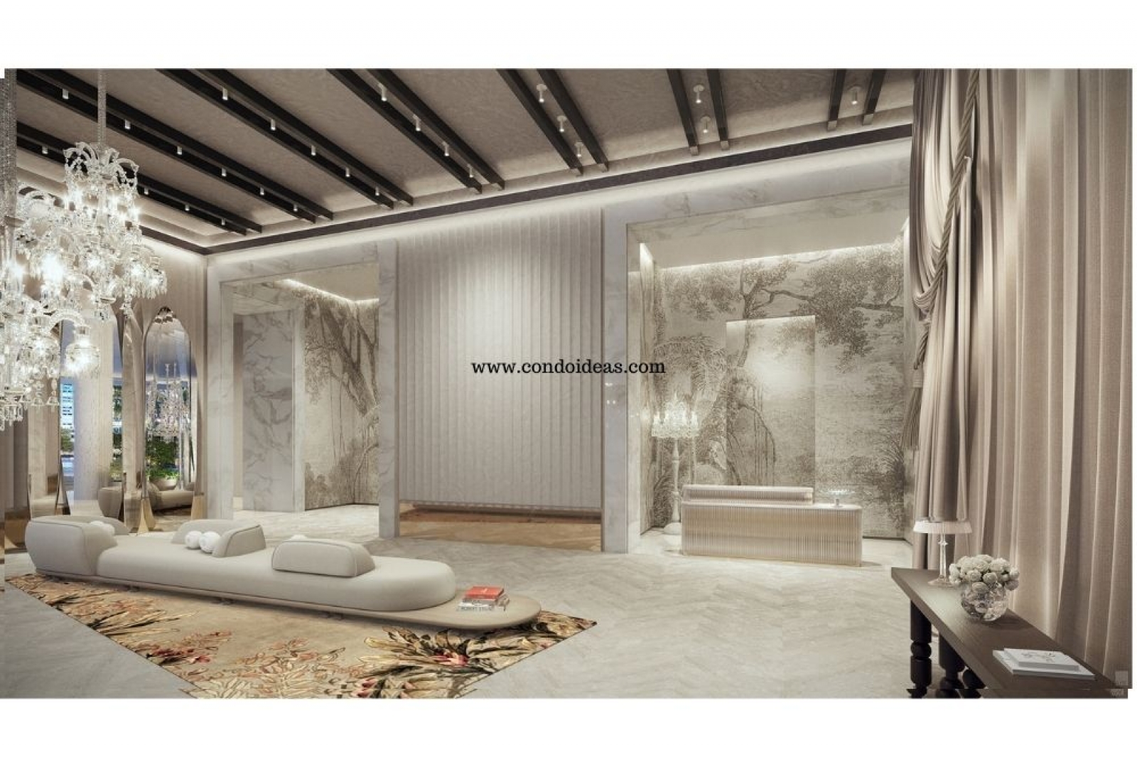 Exquisitely appointed entrance lobby with grand high ceilings leading directly to three banks of double private elevators to each residence