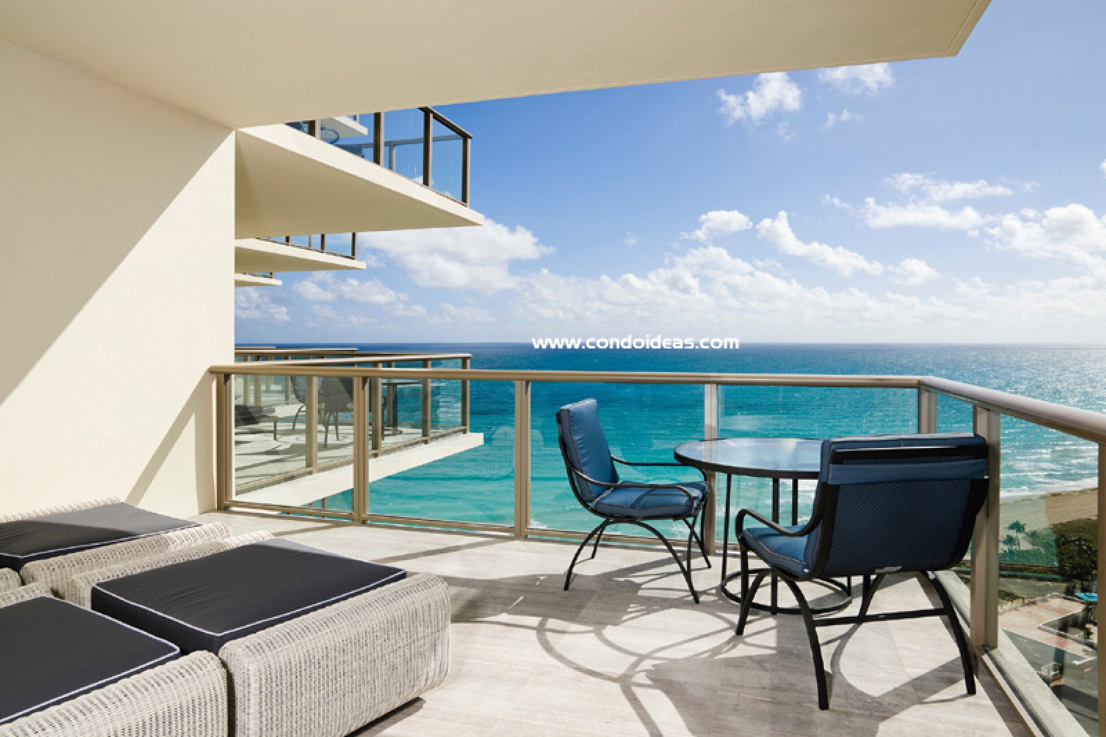 Expansive private balconies featuring bronze glass railings, large outdoor living areas and breathtaking views